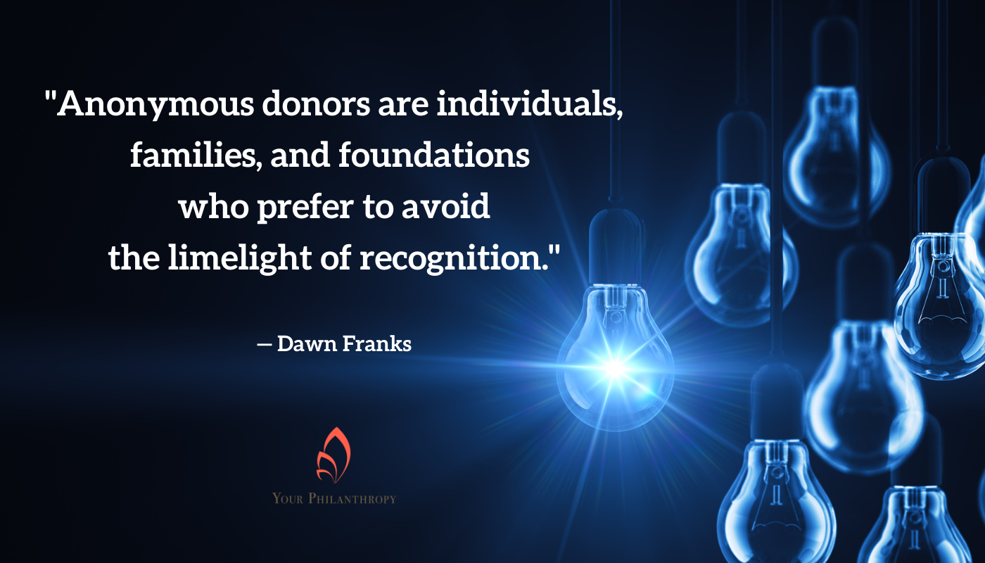 Anonymous donors are individuals, families, and foundations who prefer to avoid the limelight of recognition. Their reasons vary from discomfort with recognition generally to a preference to fund under the radar and reduce unsolicited asks from nonprofit organizations they haven’t historically funded.