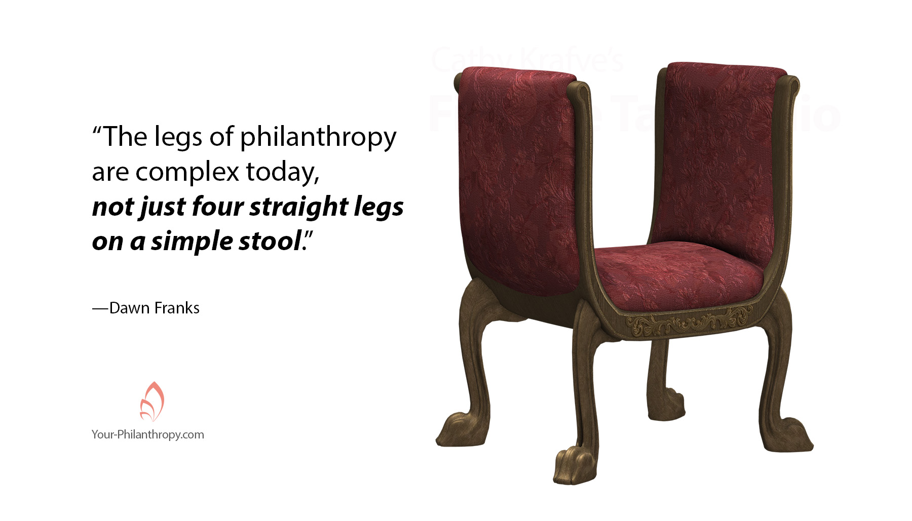 The legs of philanthropy are complex today, not just four straight legs on a simple stool. They often resemble the Chippendale corner chair with Acanthus leaves and ball and claw feet. There is ample detail in which to get lost.