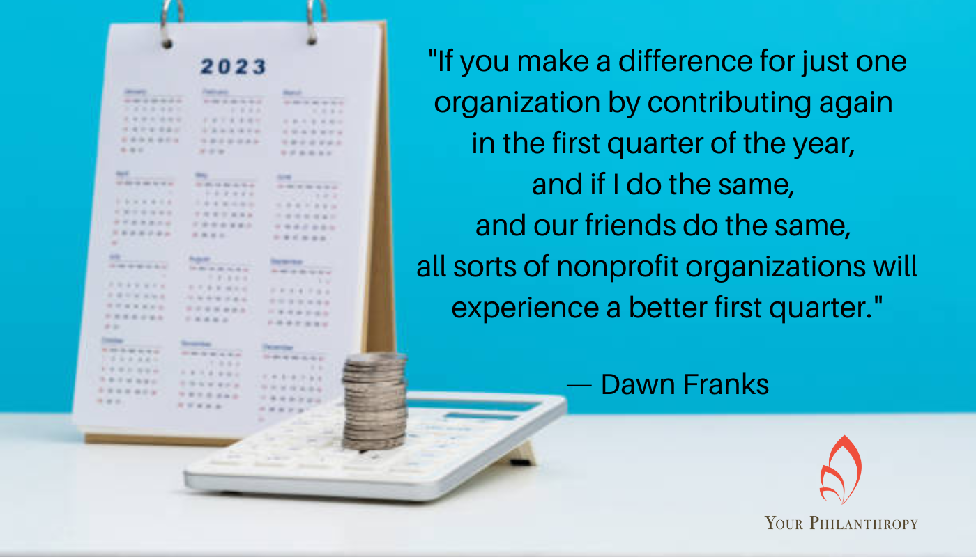 If you make a difference for just one organization by contributing again in the first quarter of the year, and if I do the same, and our friends do the same, all sorts of nonprofit organizations will experience a better first quarter.