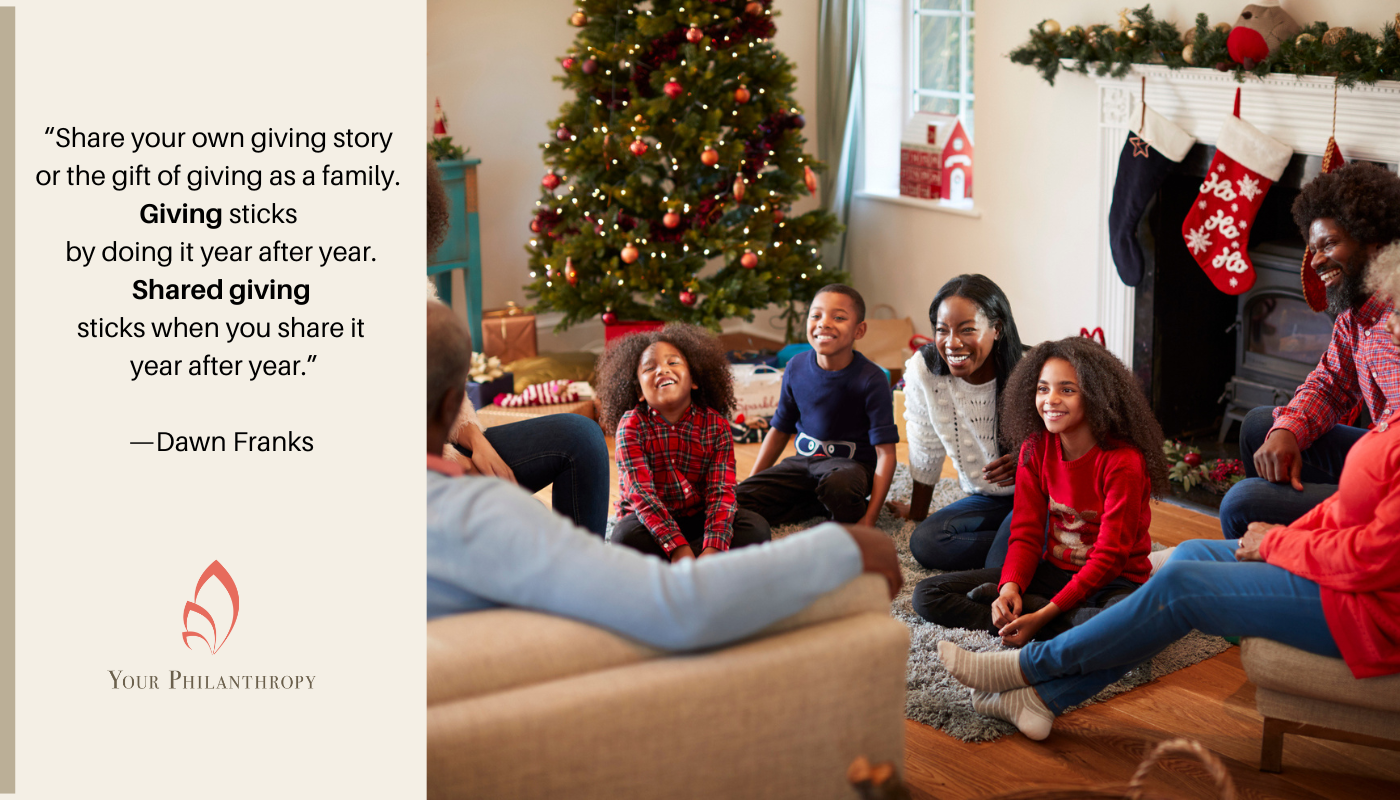 If you have family around this holiday season, I hope you’ll spend time on this last rung for at least one teachable moment. Share your own giving story or the gift of giving as a family. Giving sticks by doing it year after year. Shared giving sticks when you share it year after year.