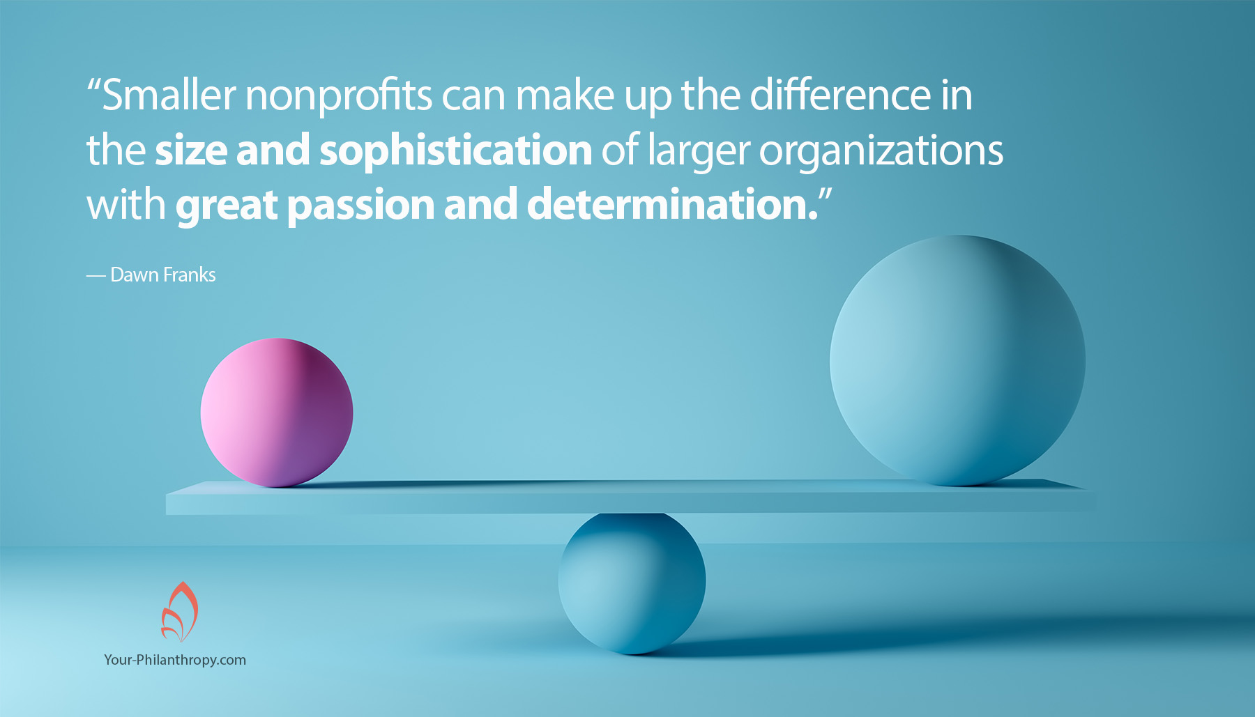 In reality, there is a world of difference between the two organizations. Even if other things are equal, like leadership, an important issue and a vital mission, the difference is stark. The small organization will be lucky to have time to send a thank you letter. If any, they may have only a few staff, often relying on volunteers to do the work.